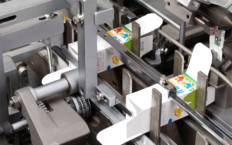 自動裝盒機(jī)進(jìn)料一般分為三個(gè)入口:說明書入口、藥瓶入口和機(jī)包盒入口。從機(jī)包盒進(jìn)料到最后包裝成型的整個(gè)過程大致可以分成四個(gè)階段:下盒、打開、裝填、合蓋。下盒動作通常是由一個(gè)吸盤從紙盒進(jìn)料口吸取一個(gè)紙盒,下行到裝盒的主線上,由一個(gè)導(dǎo)軌卡位將紙盒固定并用一個(gè)推板打開紙盒,同時(shí)會有兩個(gè)可向前移動的卡位從下面升起,從前后方向卡住紙盒的側(cè)面,使盒子打開成直角并前移到裝填區(qū)域。 在裝填區(qū)域填裝后,機(jī)器的機(jī)構(gòu)會將耳朵折進(jìn)左右的導(dǎo)軌中,然后再進(jìn)行合蓋動作。合蓋前機(jī)構(gòu)會先彎折紙盒的插舌,然后有一推板推動盒蓋彎折,使插舌插進(jìn)盒子 中并使鎖扣扣緊。合蓋動作是個(gè)關(guān)鍵性的動作,完成的好壞與紙盒的結(jié)構(gòu)和機(jī)器調(diào)節(jié)的準(zhǔn)確程度有很大關(guān)系。