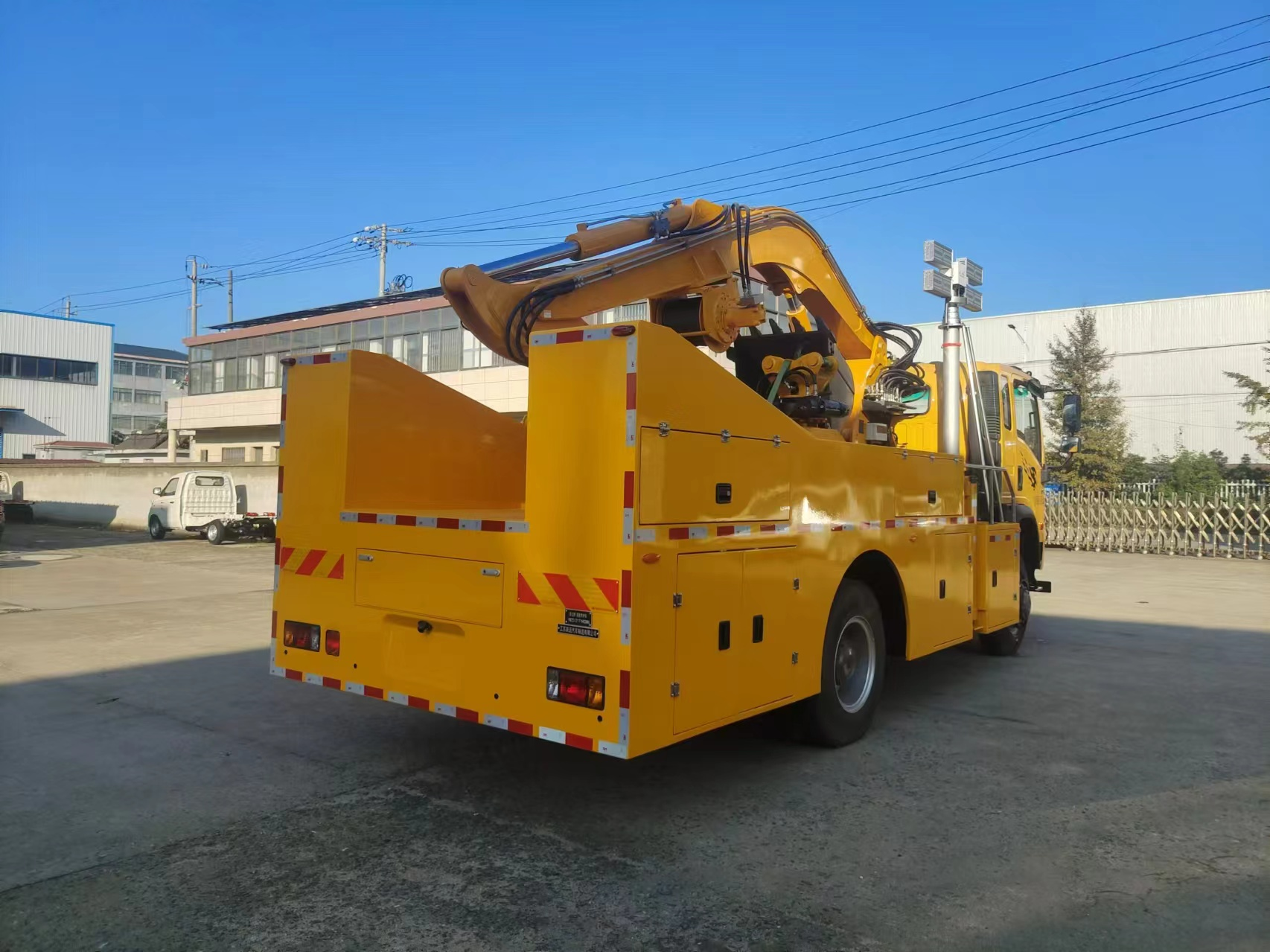 車輛配備舉升臂架、挖斗、破拆錘、抓斗、推鏟、牽引絞盤、發(fā)電機組、升降照明燈等搶險裝備,實現(xiàn)多種場景的救援作業(yè);