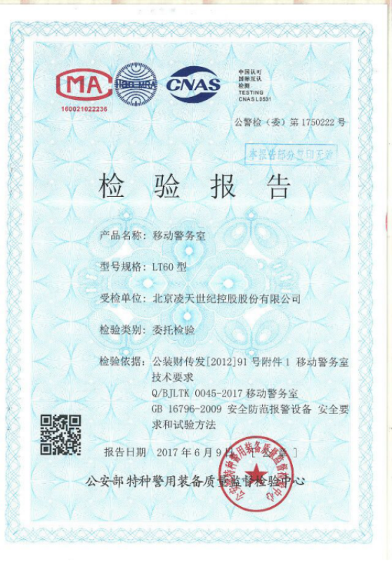 我司的移動警務室取得了公安部特種警用裝備質量監(jiān)督檢驗中心的檢驗報告。