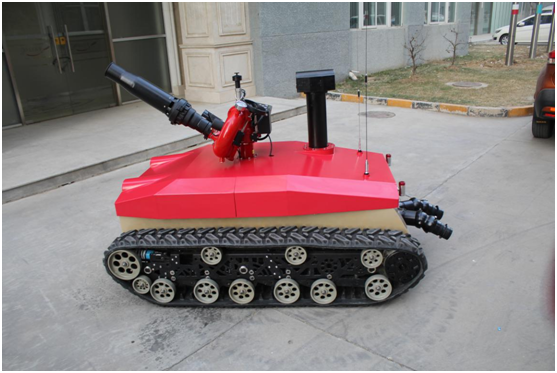 防爆消防滅火偵察機(jī)器人采用耐高溫履帶避震式底盤設(shè)計(jì),能夠適應(yīng)救援環(huán)境中各種復(fù)雜地面。裝配環(huán)境檢測裝置,在滅火的同時對現(xiàn)場環(huán)境數(shù)據(jù)進(jìn)行偵測。機(jī)器人由機(jī)器人主體,消防炮,環(huán)境檢測裝置,遙控箱四部分組成。主要作用是代替消防隊(duì)員進(jìn)入易燃易爆、有毒、缺氧、濃煙等危險(xiǎn)災(zāi)害事故現(xiàn)場實(shí)施有效的滅火救援、化學(xué)檢測和火場偵察。