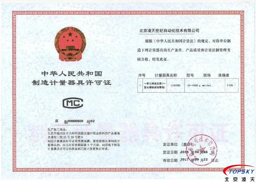 北京凌天一氧化碳檢測(cè)儀取得計(jì)量器具制造許可證(CMC)