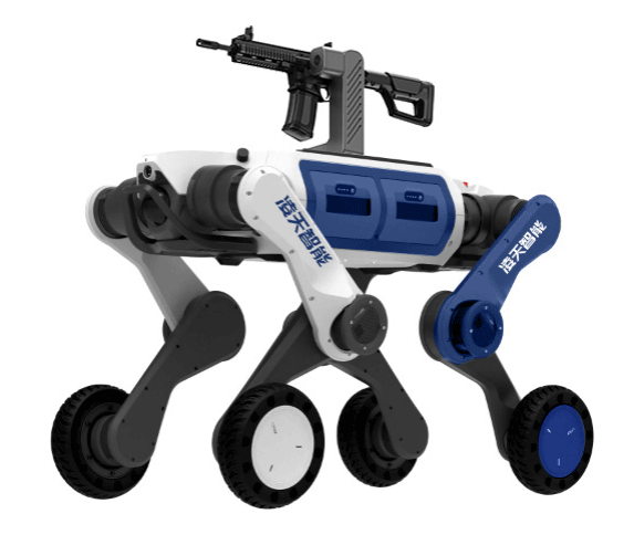 武裝打擊輪足機(jī)器狗主要用于軍事和邊防領(lǐng)域,具備攻擊和防御能力,應(yīng)用場(chǎng)景廣泛。