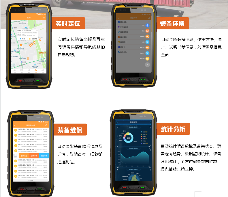 應(yīng)急消防裝備云管理平臺系統(tǒng)能夠直接通過職能人員手持的防爆終端,直接讀取系統(tǒng)內(nèi)所有的裝備、設(shè)備及具體的詳情、圖片、位置、傳輸?shù)臄?shù)據(jù),根據(jù)裝備具有特性進行實時在線監(jiān)測,當(dāng)監(jiān)測到的數(shù)據(jù)超標(biāo)時,實時進行報警及查閱報警信息。該平臺系統(tǒng)能夠結(jié)合智能防爆終端本身功能、北斗定位/GPS定位、錄像、拍照等進行信息存儲,隨時隨地查閱裝備庫、維修庫、報廢庫等級占比利用率分析,最終進行數(shù)據(jù)統(tǒng)計分析處理。此外該系統(tǒng)支持本地化業(yè)務(wù)拓展,如:現(xiàn)場監(jiān)控、無線打印,保障此平臺系統(tǒng)在不同環(huán)境中的應(yīng)用與融合。